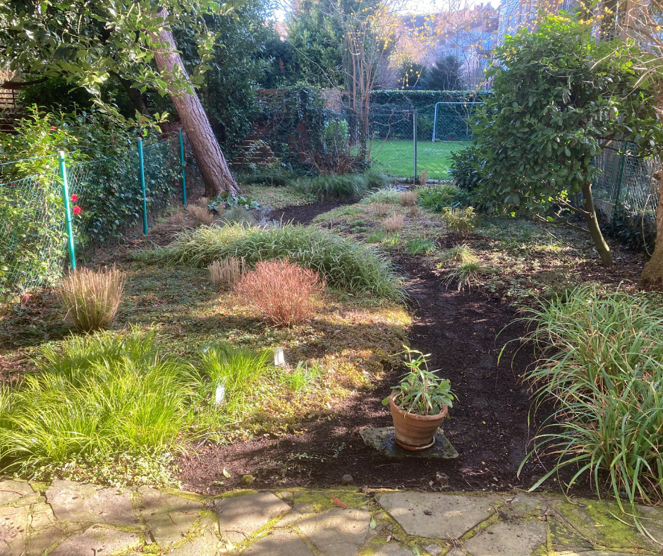 Ursprünglich der hintere Teil eines langen Gartengrundstücks mit altem Baumbestand, war der Garten im Zuge der Bauarbeiten komplett gerodet worden. Vorrausschauend wurde der Mutterboden vor Baubeginn auf Halde geschoben und vor Verunreinigungen während der Bauphase abgeschottet, so dass er hinterher wieder aufgebracht, aufbereitet und eingesetzt werden konnte.